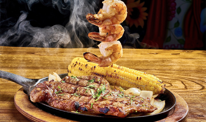 Shell Steak, Corn and Jumbo Shrimps, Served Over Sauteed Onions and Mushroons