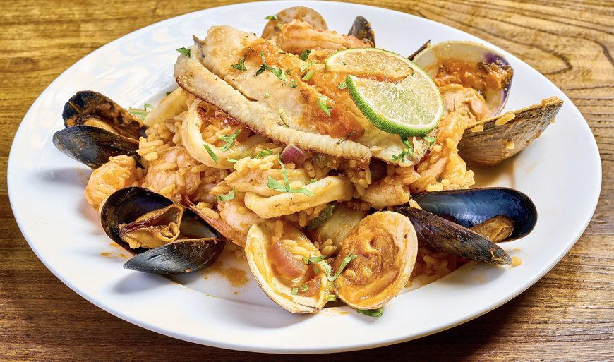 A Combination Of Fresh Clams, Mussels, Calamari, Shrimp, and Tilapia mixed with vegetables and rice